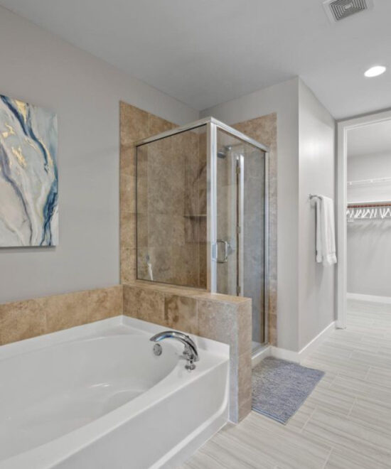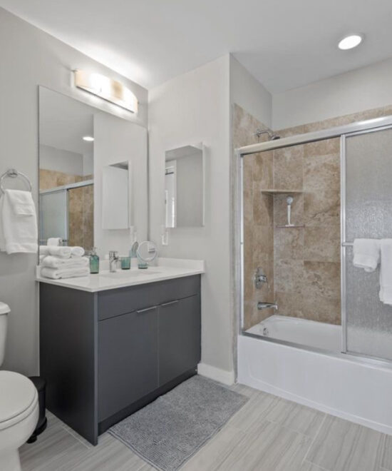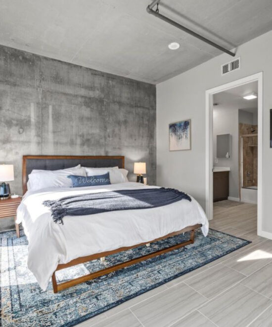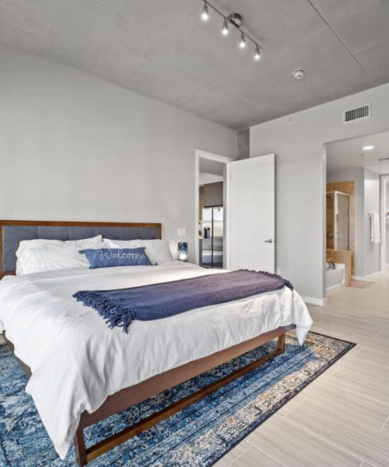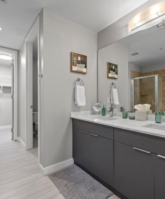 This modern 2-bedroom condo features high ceilings, floor-to-ceiling windows, and a luxurious bathroom with dual vanities, a walk-in closet, and a separate shower and tub—offering both comfort and sophistication.