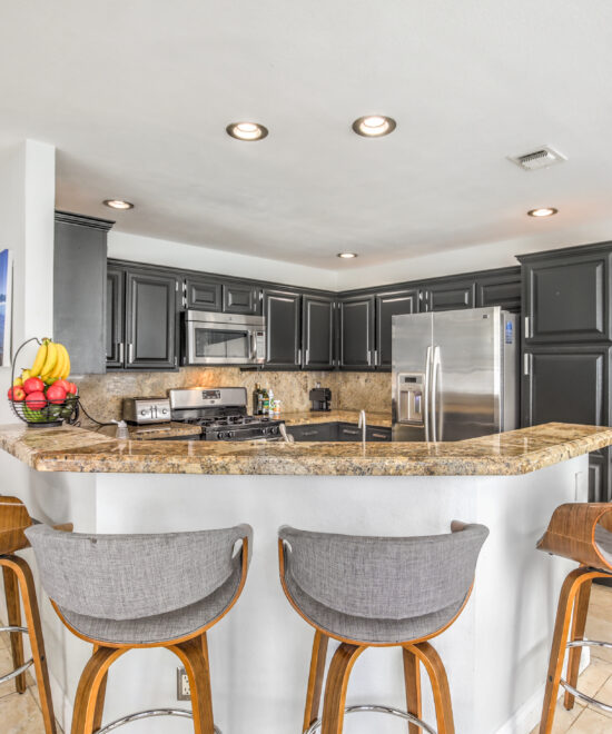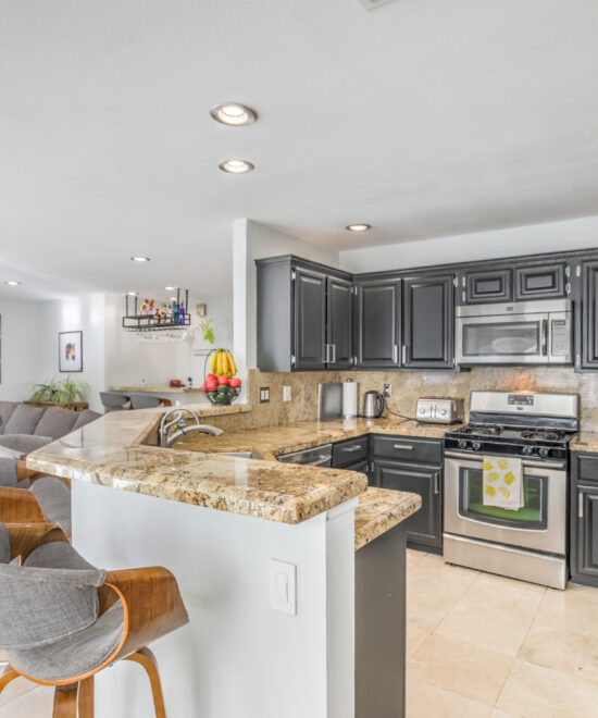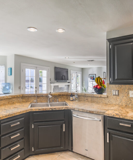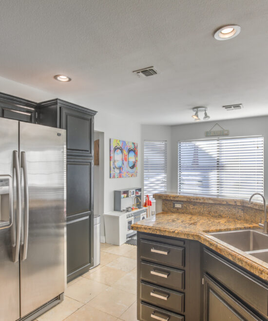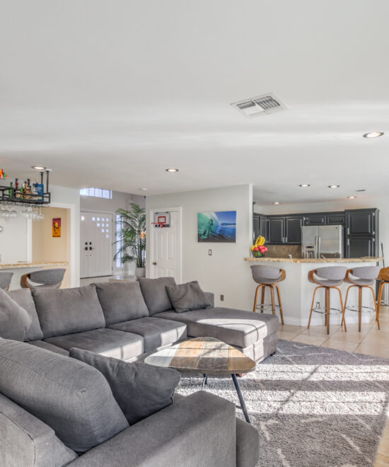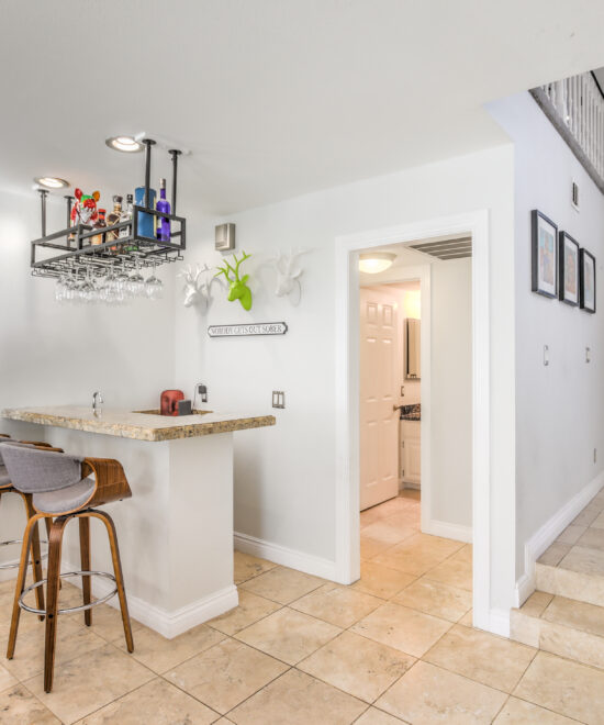 This renovated home in The Lakes showcases travertine floors, a wet bar, remodeled bathrooms, and a spacious primary suite with balcony views and his-and-hers walk-in closets.